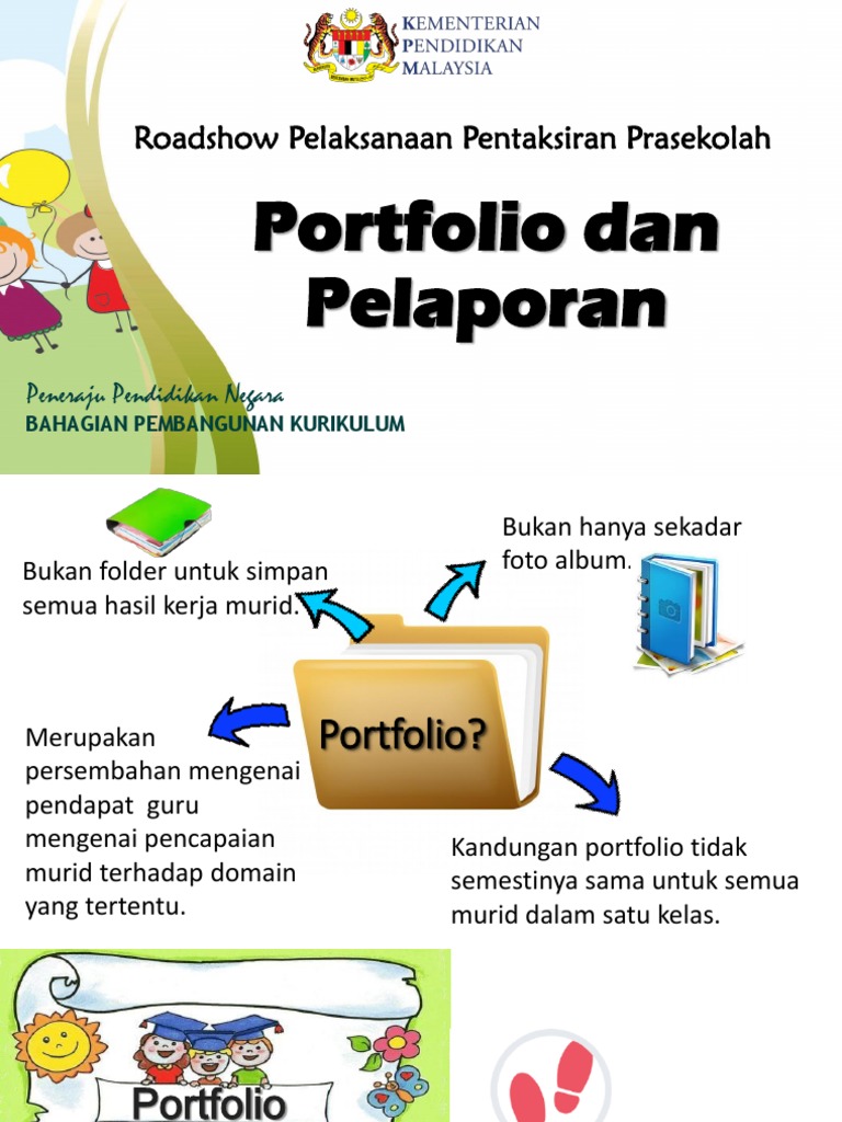 Portfolio prasekolah bukan sahaja satu folder yang mencerminkan pencapaian kanak-kanak dalam tempoh tertentu ia juga kerjasama guru dan ibu bapa dalam meneroka dan mencerminkan dinamik keupayaan dan pembangunan fizikal kanak-kanak. TEKNOLOGI PENTAKSIRAN 1 JUMLAH TAJUK PORTFOLIO KUMPULAN EL SO1 DISEDIAKAN OLEH NAMA NO ID NO TELEFON ASNAH BTE ARIFFIN D049409 0135453402 DR MOHD FAIZAL NIZAM LEE ABDULLAH. Justeru itu setiap guru di sekolah juga tidak terkecuali untuk mengikuti pekeliling ini.